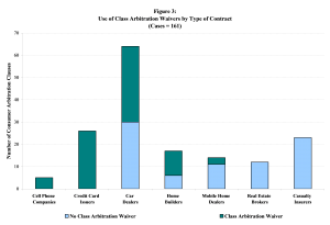 “[a]ll cases involving cell phone companies (5 of 5, or 100.0%) and all cases involving credit card issuers (26 of 26, or 100.0%) arose out of arbitration clauses with class arbitration waivers. By comparison, just over half of cases arising out of car sale contracts (34 of 64, or 53.1%) and contracts with home builders (11 of 17, or 64.7%) included class arbitration waivers. Meanwhile, none of the cases arising out of insurance contracts or real estate brokerage agreements included class arbitration waivers.”