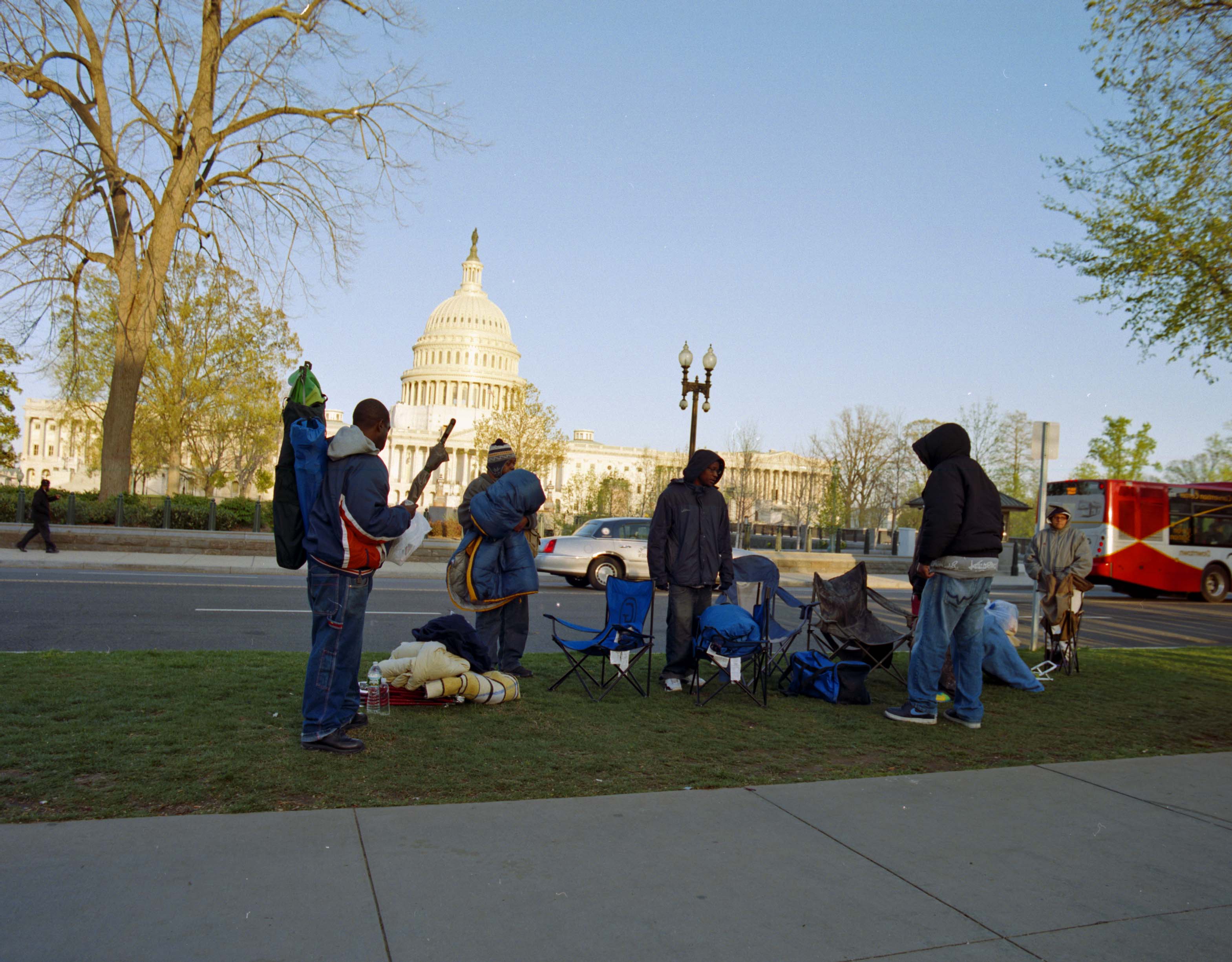 Kathie, a lawyer from Atlanta and the first person in the public line on Friday who was not a professional line stander, told me that she considered joining the Supreme Court bar to avoid the public line, but – because she thought it was unfair that bar members got their own line – ultimately decided to wait out in the cold and rain the way everyone else did. This was no small commitment considering that temperatures dipped down into the mid-thirties two nights in a row during her four-day wait. Where is the closest bathroom, you wonder? The Union Station Starbucks was the most popular one, but it closes at nine o’clock each night. The man pictured in the hammock next to her, Danny, was one of many professional line standers. When he isn’t standing in line, Danny is unemployed, so he was grateful to have the work outside the Court.