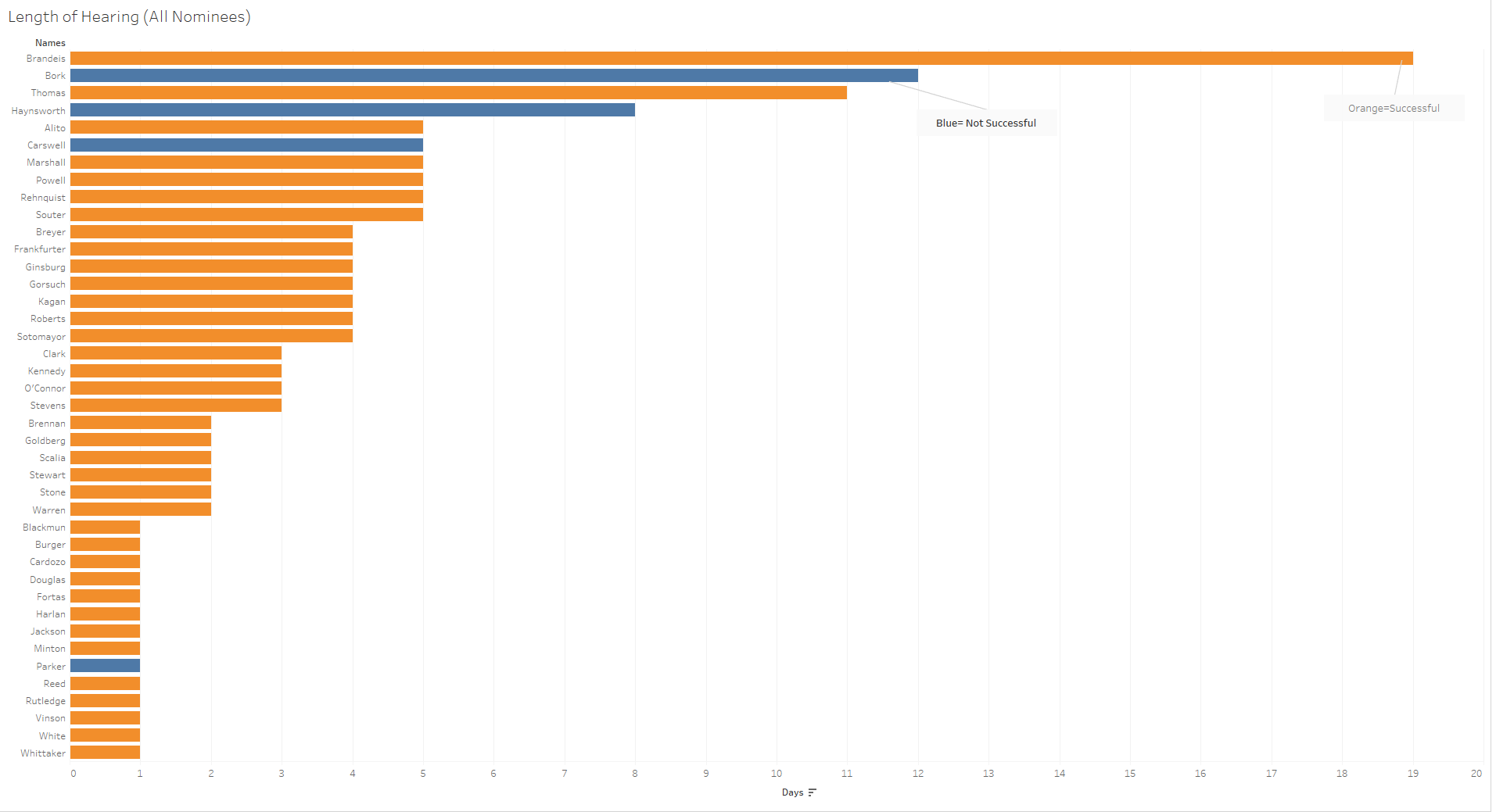 Since 1975, Bork was the only nominee who made it to the Senate hearing and was not confirmed. Going back to 1900, only 10 nominated individuals were not later confirmed. Across the history of the Supreme Court, the votes for nominees were overwhelmingly favorable. When organized from most net votes to fewest, the confirmation votes look as follows.