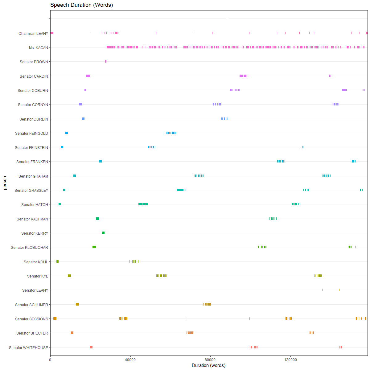 This post crunches data from the transcripts of the past four confirmation hearings — those for Justices Neil Gorsuch, Elena Kagan, Sonia Sotomayor and Samuel Alito– to see how senators’ speaking patterns and interactions with Supreme Court nominees shape the process. These four hearings are a nice mix because they showcase nominees from two Democratic and two Republican presidents. This analysis also shows how we can leverage more information from the transcripts than may be readily apparent from watching the hearings on TV.