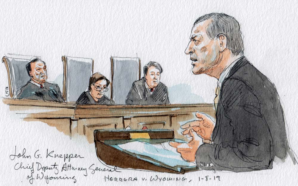The argument began with George Hicks, counsel for the petitioner, Clayvin Herrera, confronting questions about why the U.S. Court of Appeals for the 10th Circuit’s 1995 decision Crow Tribe v. Repsis, which found that the Crow’s treaty right had been abrogated, did not bar Herrera from relitigating the treaty issue. In a discussion that Justice Samuel Alito likened to law school, the justices pressed Hicks on the effect for future litigation of decisions like Repsis that reached multiple, alternative holdings. But when John Knepper, counsel for Wyoming, rose, the justices had pointed questions on this topic for him, too, particularly about his insistence that Mille Lacs (which undermined the doctrinal foundation for Repsis) was not a significant enough change in the legal context to warrant an exception to the normal preclusion rules. When asked what the test for such a change would be, Knepper offered up a “a major doctrinal shift.”