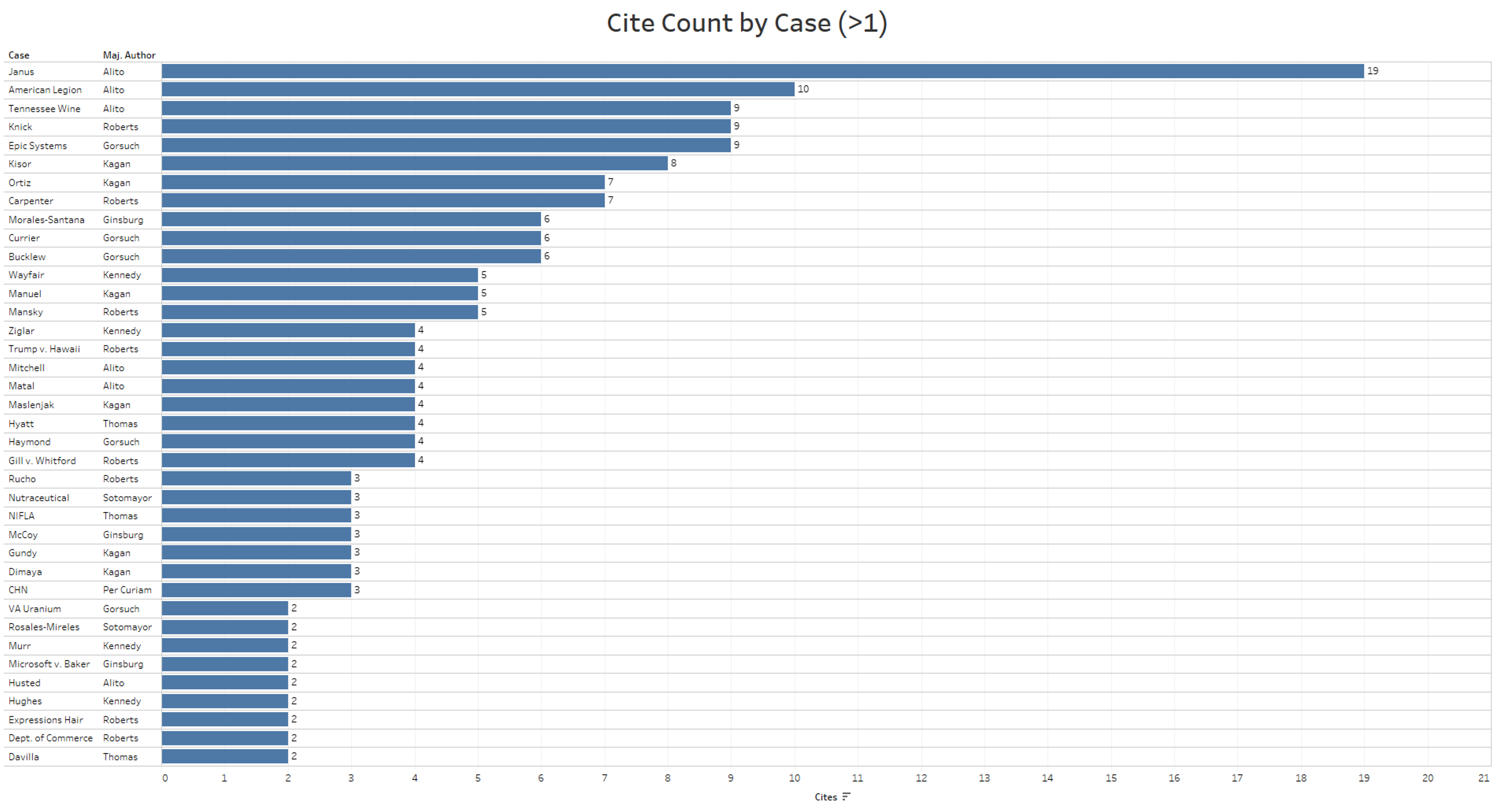 The greatest number of cites from any of these relationships is between Justice Elena Kagan and Scalia. Kagan cited Scalia’s opinions 11 times, including seven dissents, three concurrences and one concurrence and dissent in part. Kagan’s seven cites to Scalia’s dissents topped the count for one justice’s cites to another’s dissents, and was followed by Alito’s six cites to Thomas’ dissents. In terms of concurrences, Gorsuch cited Thomas seven times, the most among the justices, followed by Roberts’ six citations to Sotomayor’s concurrences. Gorsuch also had the second-most cites to a particular justice after Kagan’s cites to Scalia’s opinions, with his eight cites to Thomas’ separate opinions.