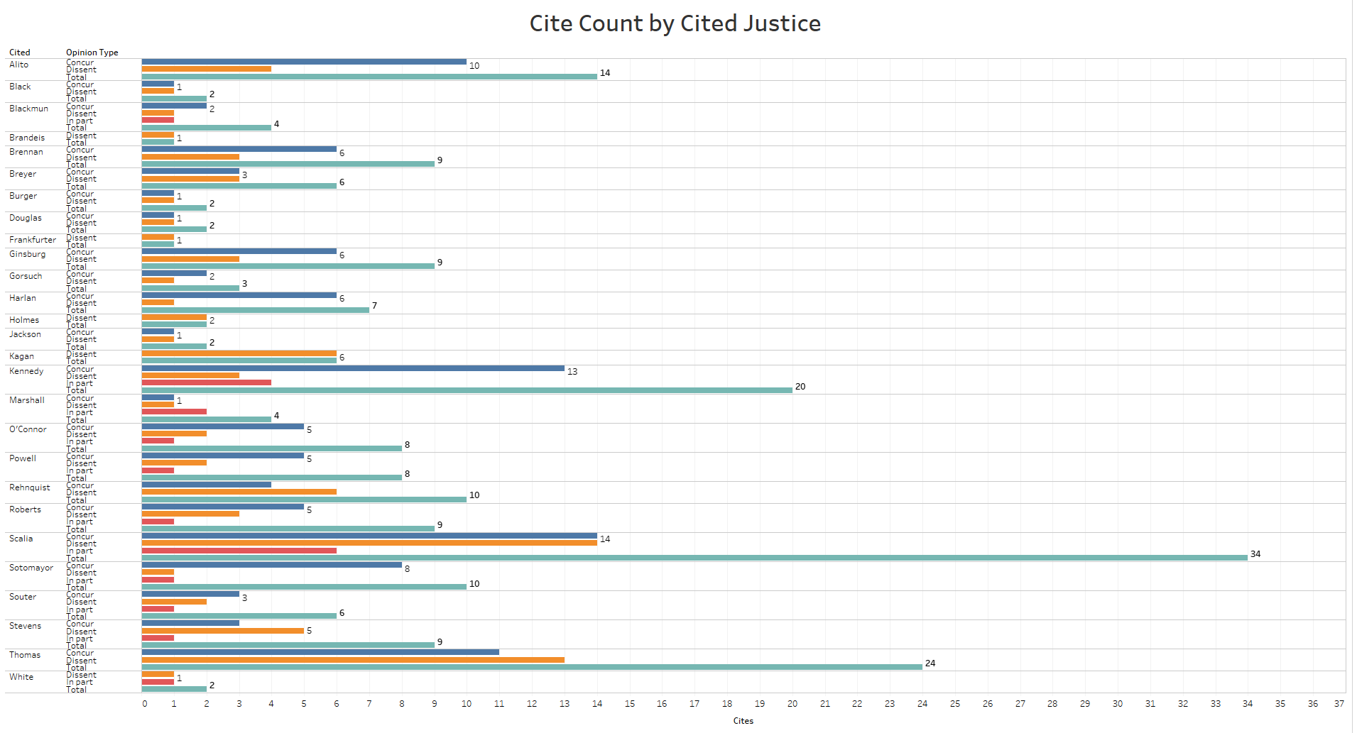 What might surprise some, though, is that Scalia was cited equally for his dissents and concurrences. The second-most-cited justice, Thomas, was one of the most prolific dissenters of the past several terms. Thomas’ dissents were cited more often than his concurrences, but only by a ratio of 13 to 11. Kennedy and Alito were the third and fourth most-cited justices. Multiple retired justices were also cited frequently, including Rehnquist 10 times and Justice William Brennan nine.