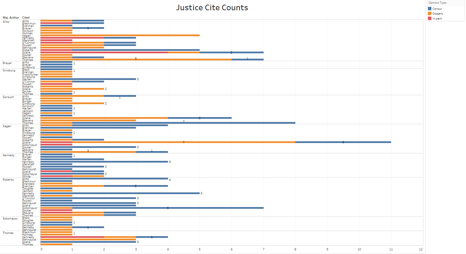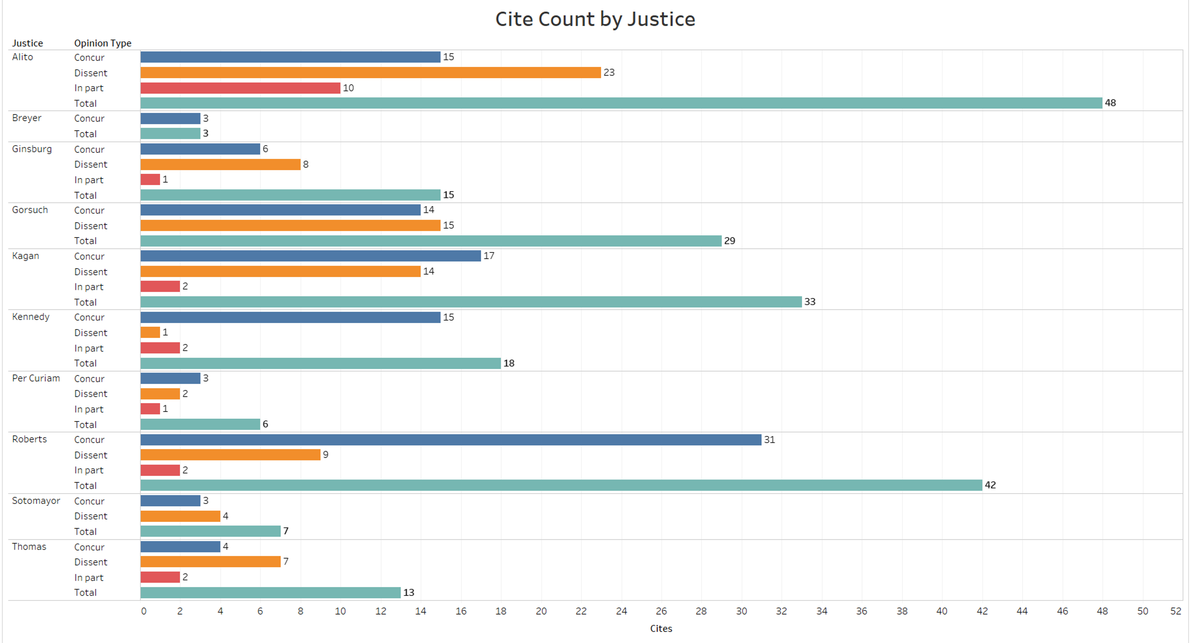 Alito’s cite count runs so high in part due to the fact that he authored the three majority opinions with the most citations to prior separate opinions: Janus, American Legion and Tennessee Wine and Spirits Retailers Association v. Thomas (which is one of several majority opinions that contain nine cites to prior separate opinions). Alito not only cited the most dissenting opinions but also cited the most concurrences and dissents in part. Roberts cited the second most prior separate opinions with 42. His mix of citations is far more weighted toward concurrences, which constitute 31 of his 42 cites. Justice Stephen Breyer cited the fewest separate opinions with three; all came from concurrences.