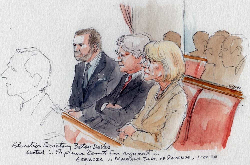 The courtroom is filling up fast this morning. Secretary of Education Betsy DeVos is here, seated in the front row of the public gallery with some aides from her department. She has been an advocate of school choice and her boss, President Donald Trump, has urged a federal tax credit for contributions to scholarship programs. The federal proposal probably faces more political than legal hurdles. The case today asks whether a Montana constitutional prohibition on aid to religion violates the free exercise of religion rights of parents who want to use scholarships stemming from the tax credit at religious schools.