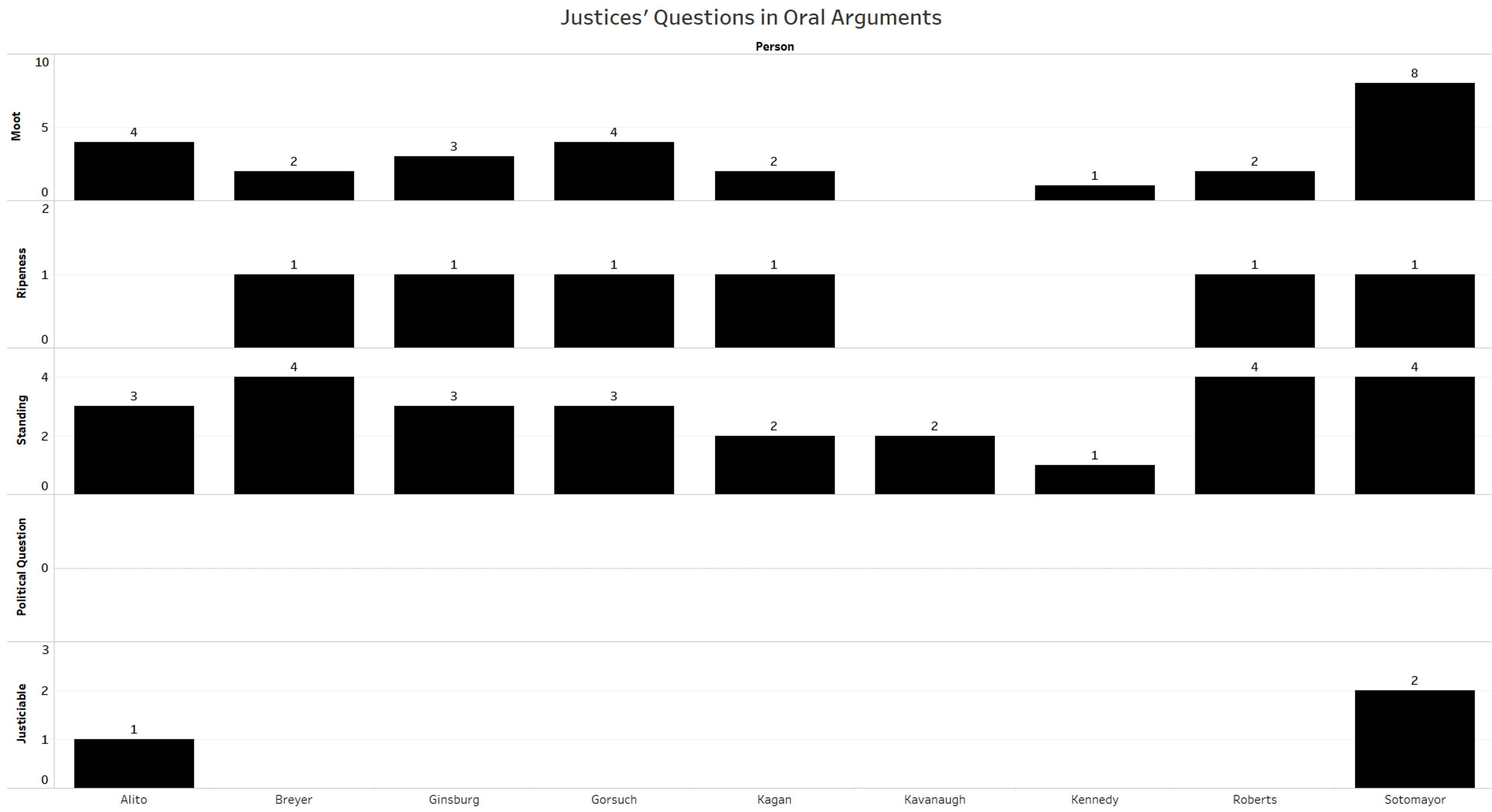 The next figure breaks the justices down by the number of oral arguments in which they mentioned at least one of these justiciability concerns.