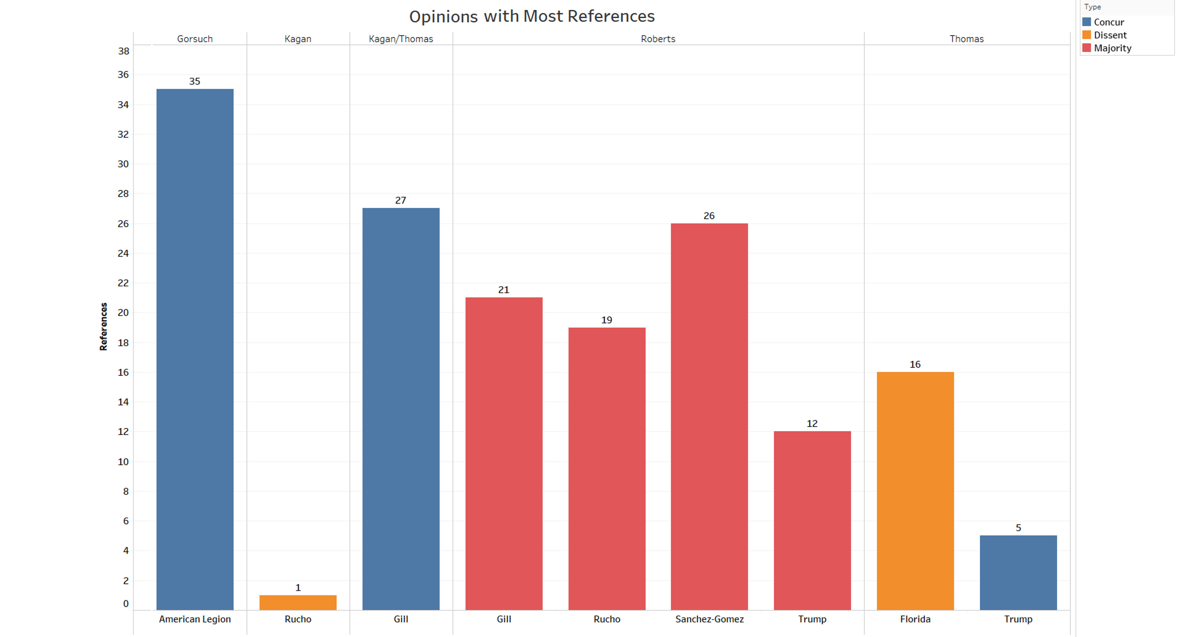 Gorsuch’s concurrence in American Legion v. American Humanist Association, which mainly hinged on standing, referenced at least one of these terms the most times, with 35 references. This is followed by Roberts’ opinion in Sanchez Gomez, with 26. (Justice Elena Kagan’s and Thomas’ concurrences in Gill v. Whitford together referenced these doctrines 27 times.)