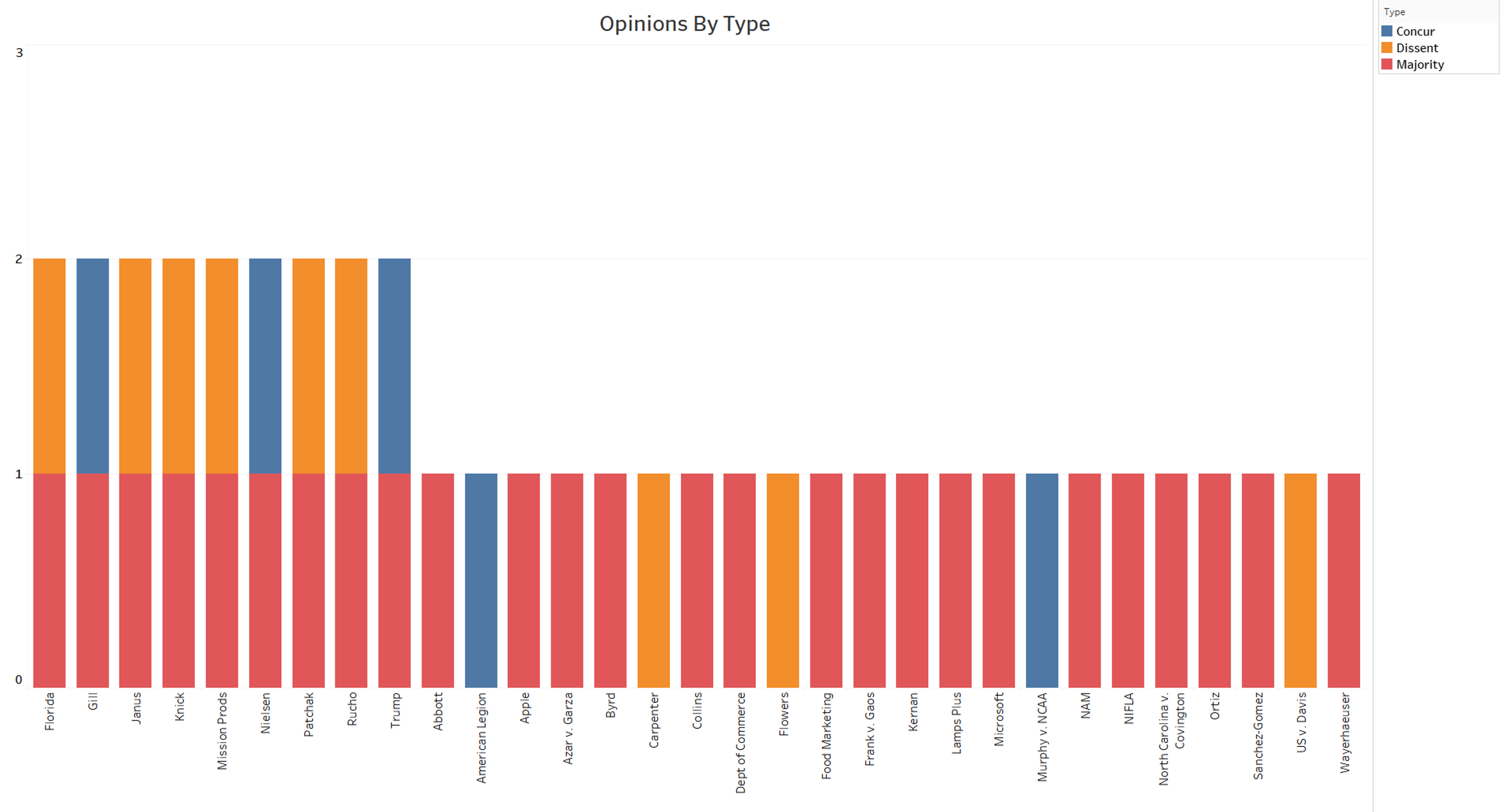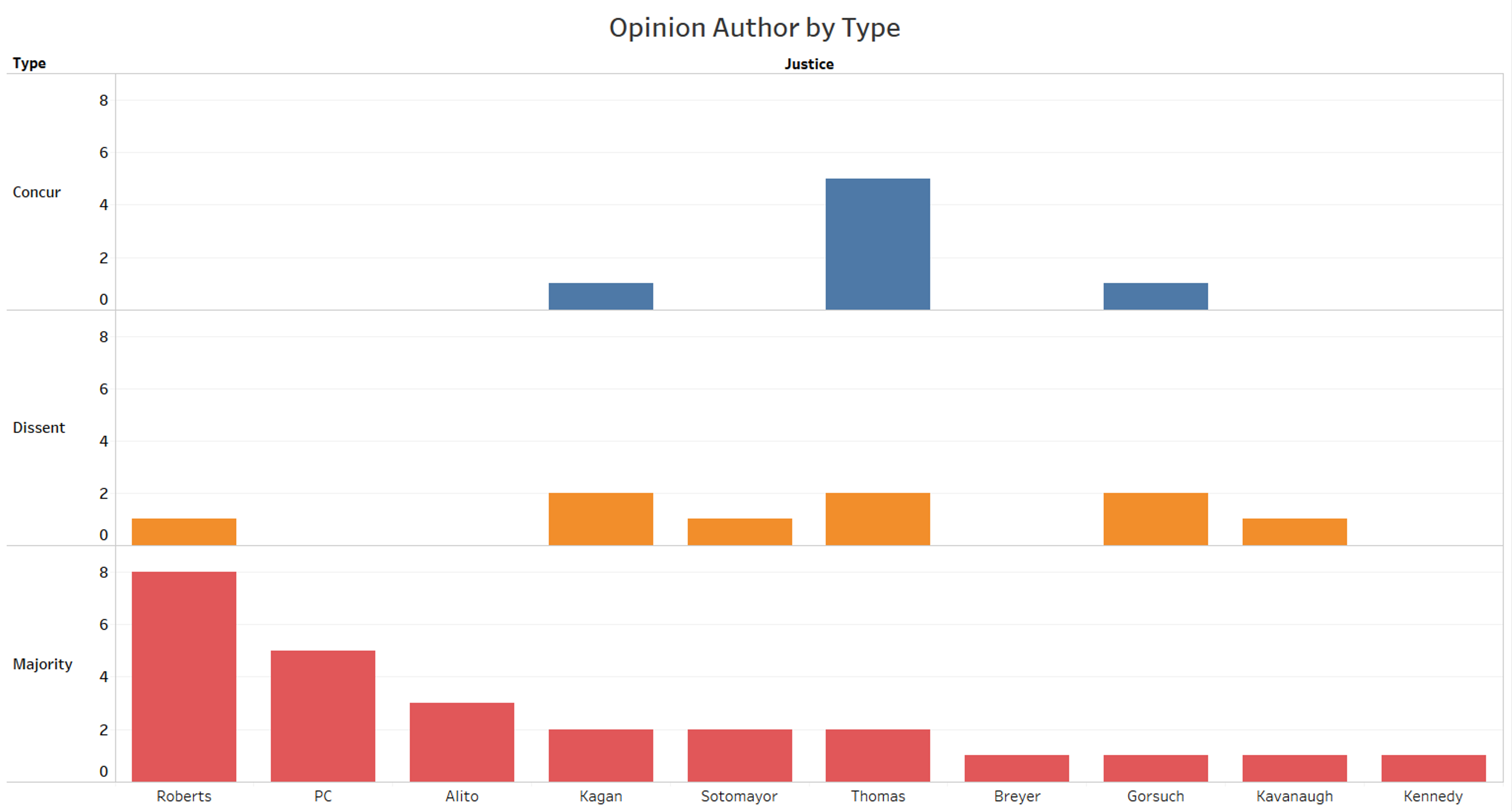 Roberts occupies a unique space in this graph. He not only wrote more opinions in this figure than any other justice, with four, but he is also the only justice in this figure to write a majority opinion.