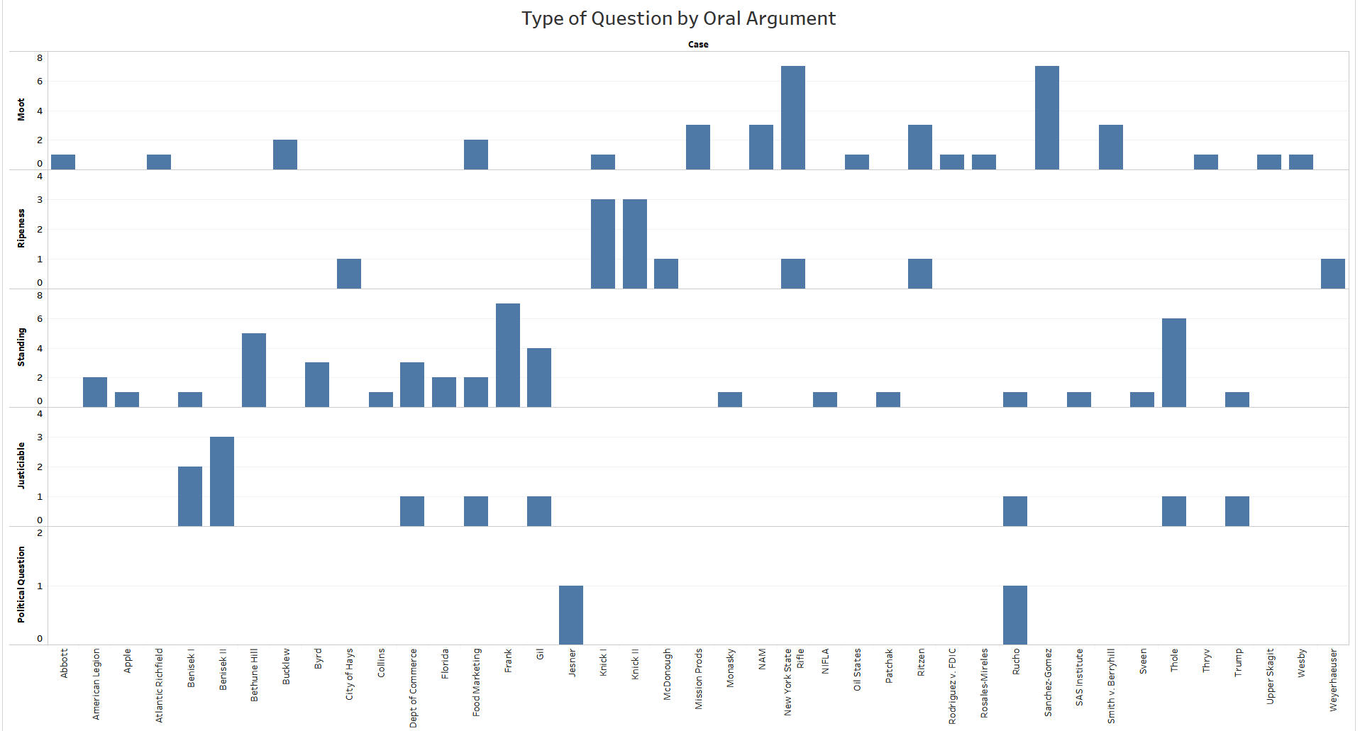 Standing and mootness questions were most prevalent, followed by questions related to general justiciability and ripeness, and lastly those related to political questions. Mootness came up most often (six times) in both New York State Rifle & Pistol Association Inc. v. City of New York, New York and United States v. Sanchez Gomez. Standing came up most often in arguments in Frank v. Gaos. Discussion of the political question doctrine only arose in the arguments in Jesner v. Arab Bank and Rucho.