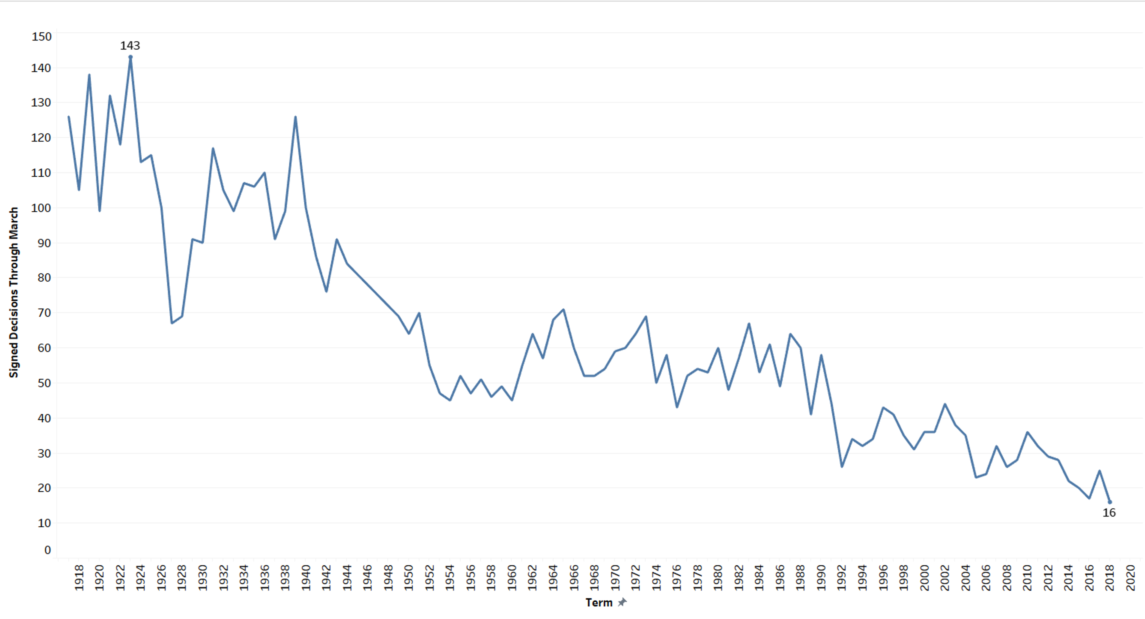 Perhaps more surprising, through March of this term, the court has decided fewer cases by signed opinion than it has since at least before the Spanish flu closed the court’s doors in 1918.