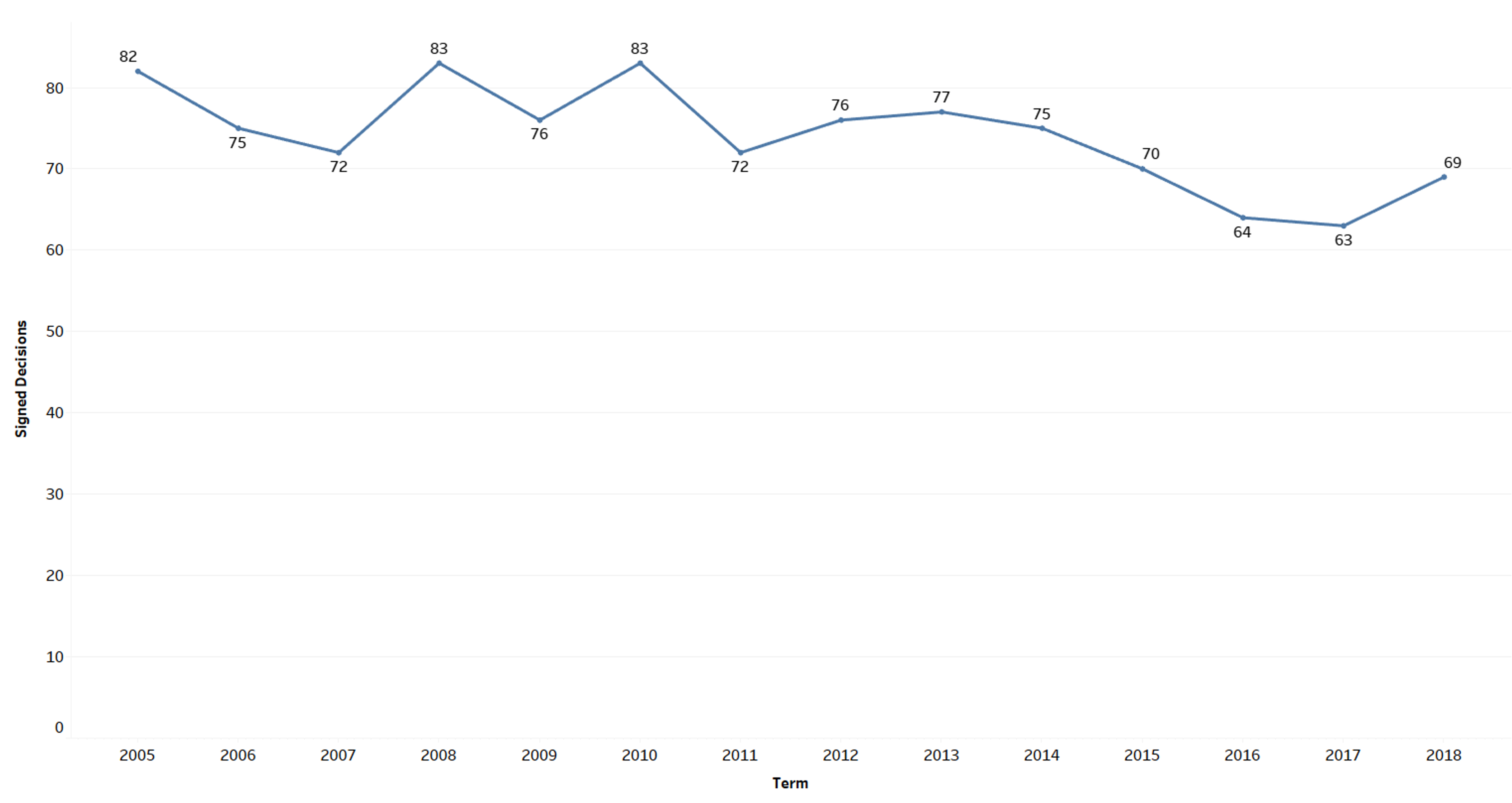 The last several terms have seen their share of anomalies. Because of its eight-justice composition, the court had several equally divided decisions in the 2015-2016 term. The justices seemed reluctant to grant many cases during the 2016-2017 term due to the question of who would fill Scalia’s vacant seat. This may have led the Roberts Court to decide fewer cases by signed decisions during each of the 2015-2017 terms than it had in any term prior (data for the two charts below provided by the Supreme Court Database).