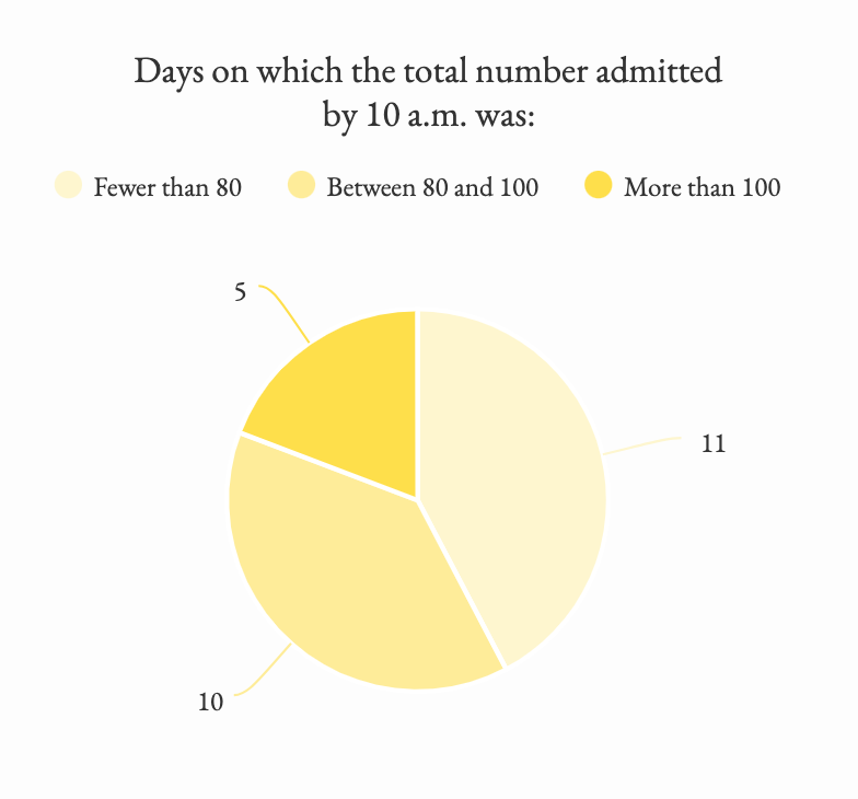 The median number of people admitted to the courtroom in total by the time arguments began at 10 a.m., including the people who obtained tickets at 7:30 a.m., was 85. The highest number of people admitted from the public line by 10 a.m. was 144 on December 3, when the justices heard arguments in cases involving federal tax laws and the federal Superfund law.