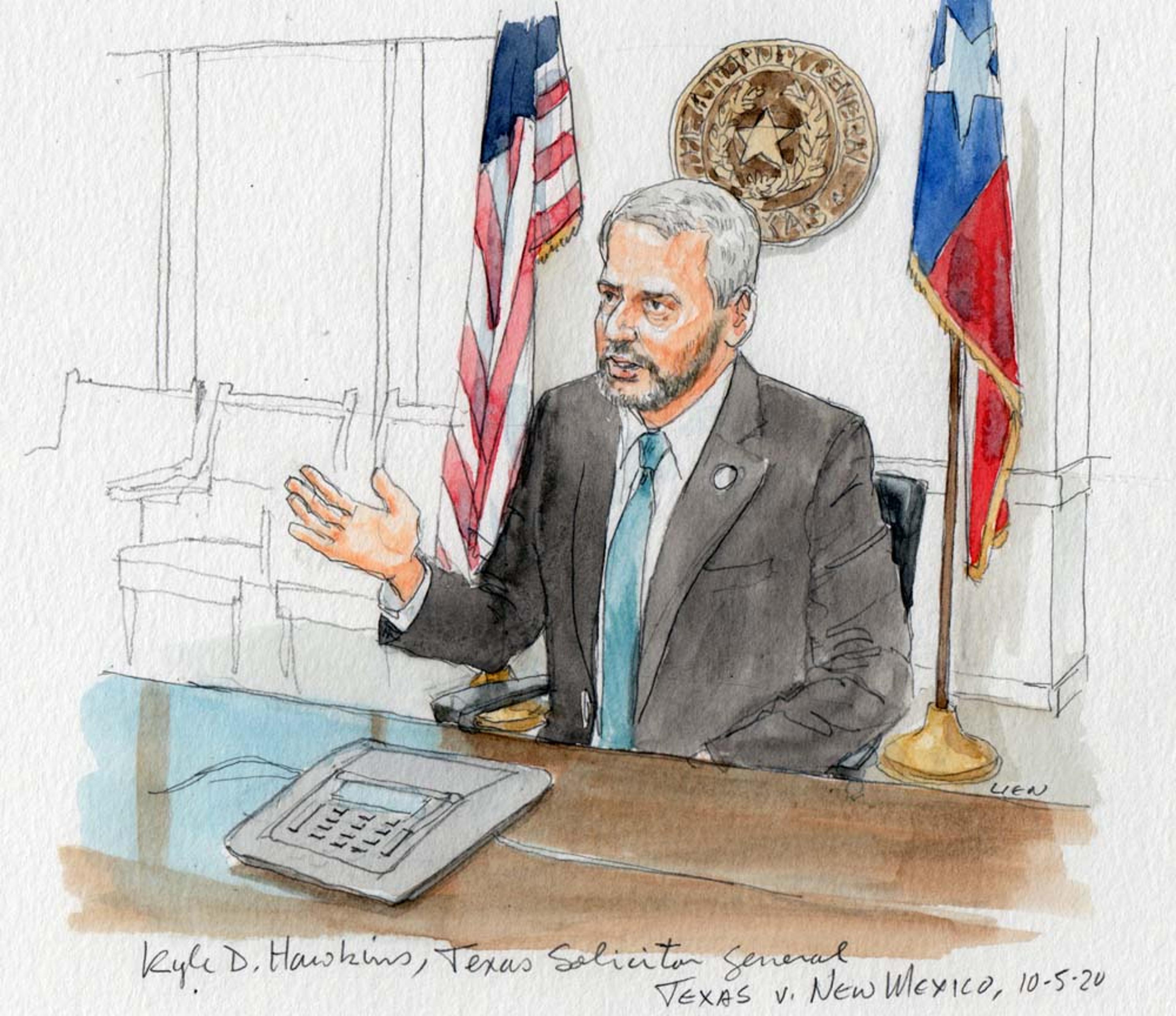 Solicitor General Kyle D. Hawkins telephones in to argue for Texas (Art Lien)