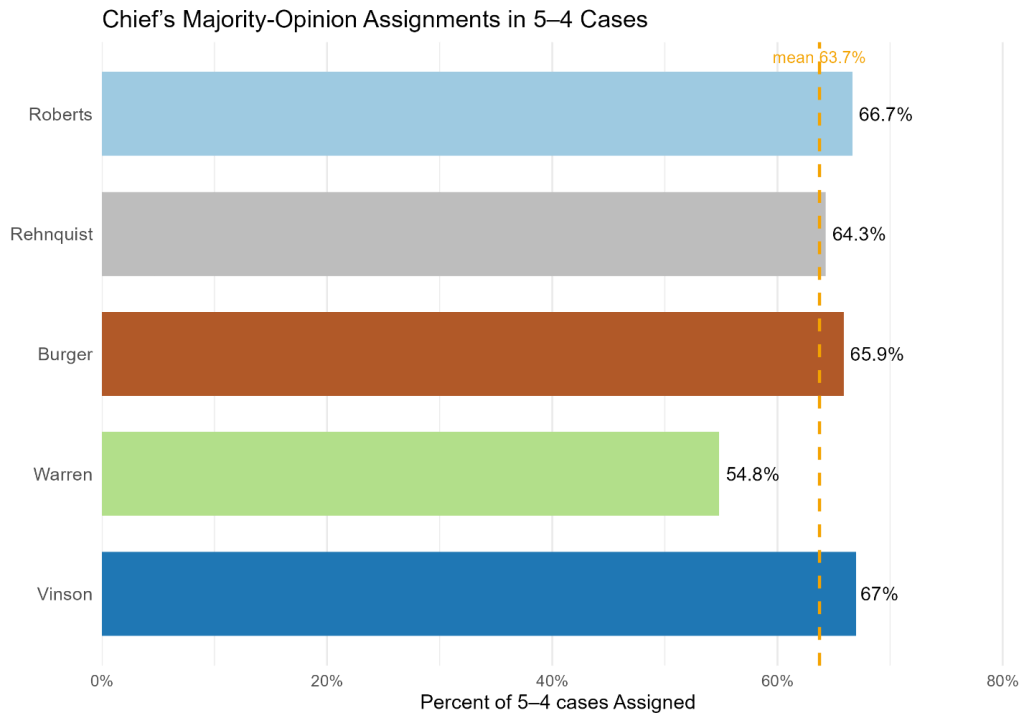 Chiefs tend to keep a large share of 5–4 assignments: Vinson 67%, Warren 54.8%, Burger 65.9%, Rehnquist 64.3%, Roberts 66.7% (among cases with a known assigner). That pattern suggests strong central steering in the closest cases, with Warren the outlier on the low side and the others clustered around two-thirds.