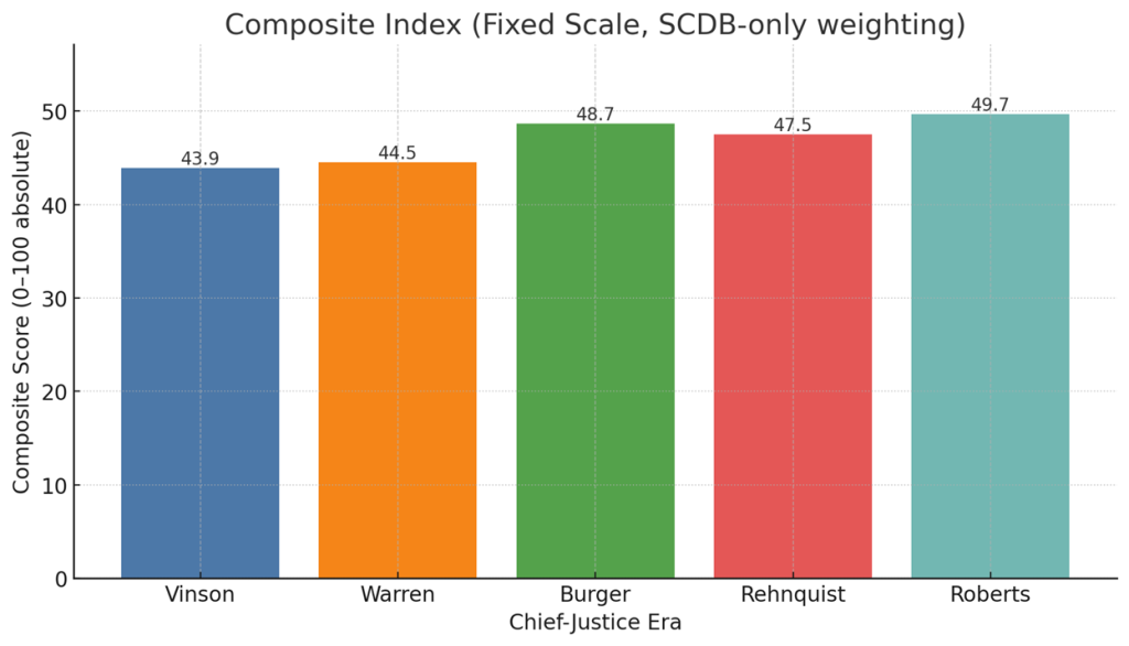 That managerial profile is exactly what the composite index is designed to detect. Roberts tops it not because he is the most transformative – Warren’s era still registers the largest formal doctrinal shifts – but because he combines the highest unanimity with targeted control of close cases. He is frequently in the majority when the court divides, he assigns strategically in 5–4 cases, and he authors when it preserves the coalition.