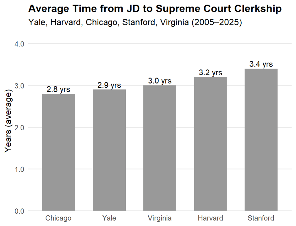 As evidenced above, among the top law schools, patterns diverge. Yale is the steadiest: most clerks arrive in two to three years through a small circle of dominant feeders. Chicago is just as fast and tight, reflecting deep ties to conservative appellate judges who hire and recommend on a predictable cadence. Harvard hits a similar mean but with a wider spread; graduates fan across circuits and into government roles, producing both fast tracks and “seasoned” four- to five-year paths. Stanford skews a bit longer, often adding an extra lower-court year or appellate-shop stint en route to D.C. from the West Coast. Virginia looks closer to Chicago: durable relationships with the U.S. Court of Appeals for the 4th and 6th Circuits keep many UVA clerks in the two- to three-year band.