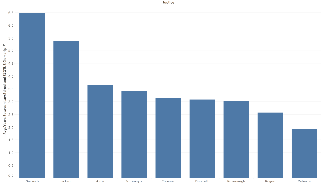 One of the more notable shifts is how long it now takes between graduating from law school and a Supreme Court clerkship. This timeline has lengthened considerably. In the mid-2000s, new Supreme Court clerks typically arrived about 2.5 years after law school; 20 years later, the average is closer to 3.8 years. This pattern reflects two shifts: candidates increasingly add a second clerkship or a year in the solicitor general’s office or at the DOJ before applying for a Supreme Court clerkship, and the feeder system rewards deeper résumés.