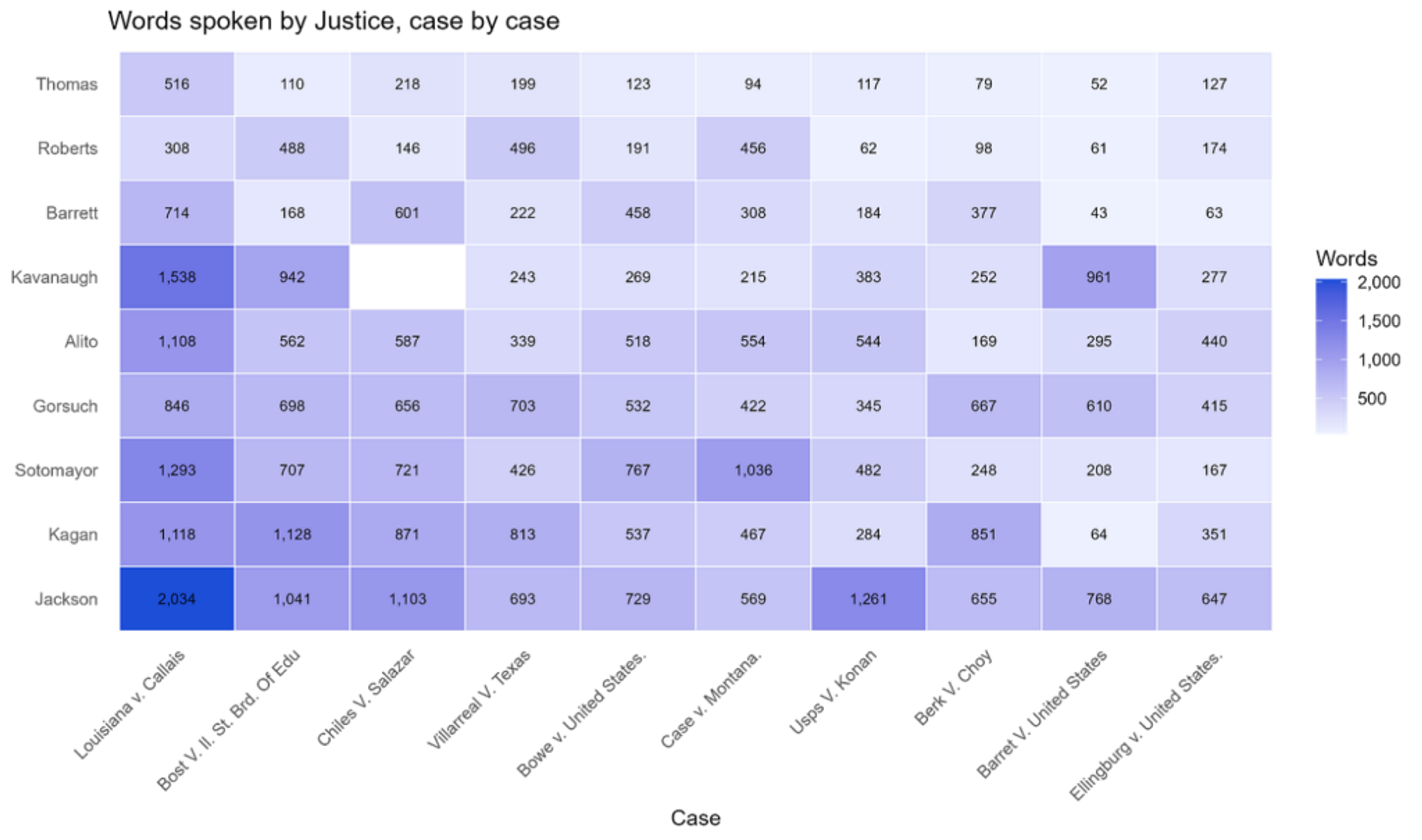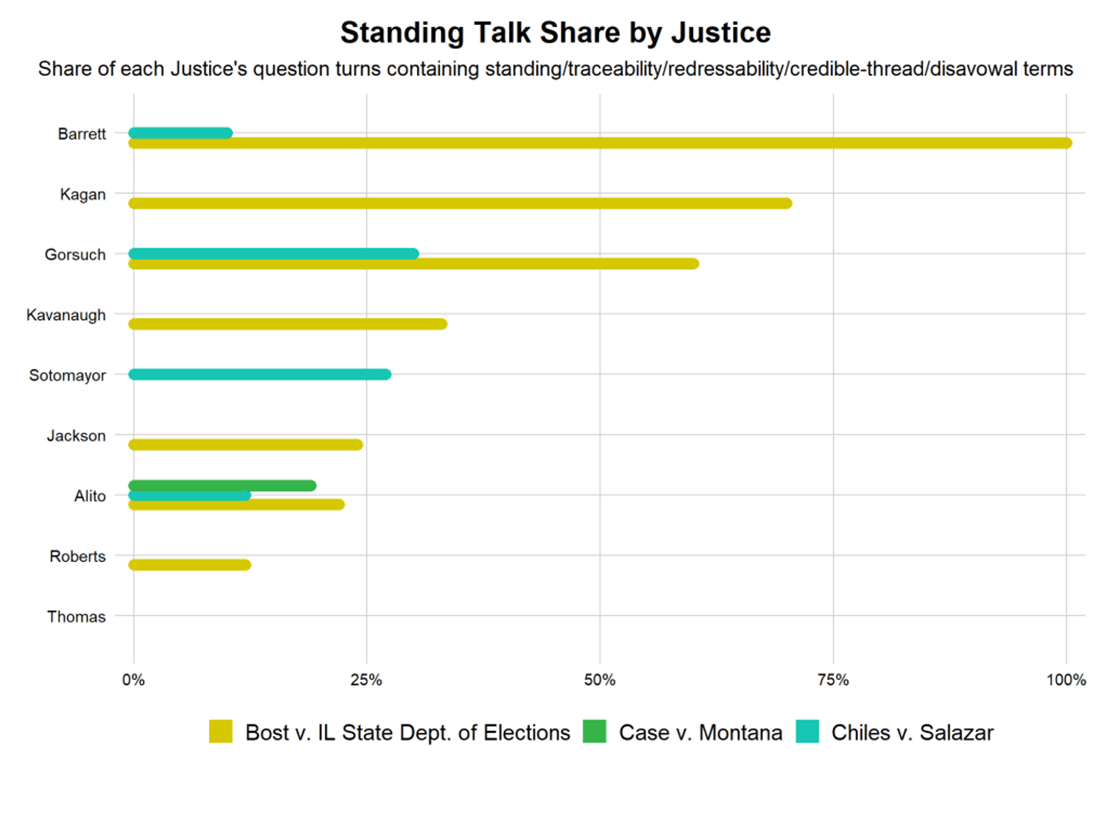 Along these lines, the data shows that words like “injury,” “traceable,” and “concrete harm” dominated early questioning from Justices Ketanji Brown Jackson, Elena Kagan, and Brett Kavanaugh.