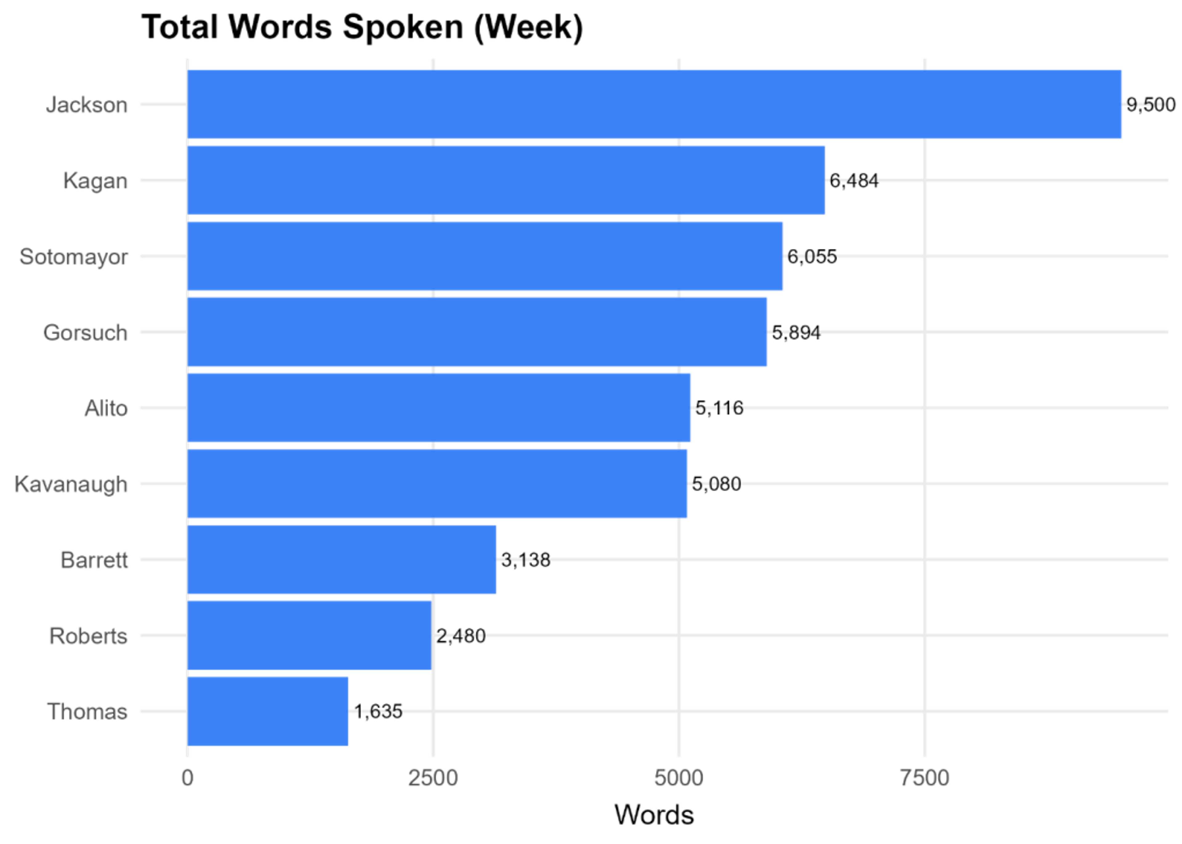 Jackson spoke the most words overall (see below), with Kagan close behind and Sotomayor third. But word count alone doesn’t tell the full story. Kagan took the longest turns, followed by Justice Amy Coney Barrett and Jackson. These justices used extended questions to explore alternatives and challenge lawyers on different interpretations. The chief justice kept the shortest turns – a style aimed at narrowing issues and moving things along. Gorsuch and (especially) Justice Clarence Thomas were similarly brief.