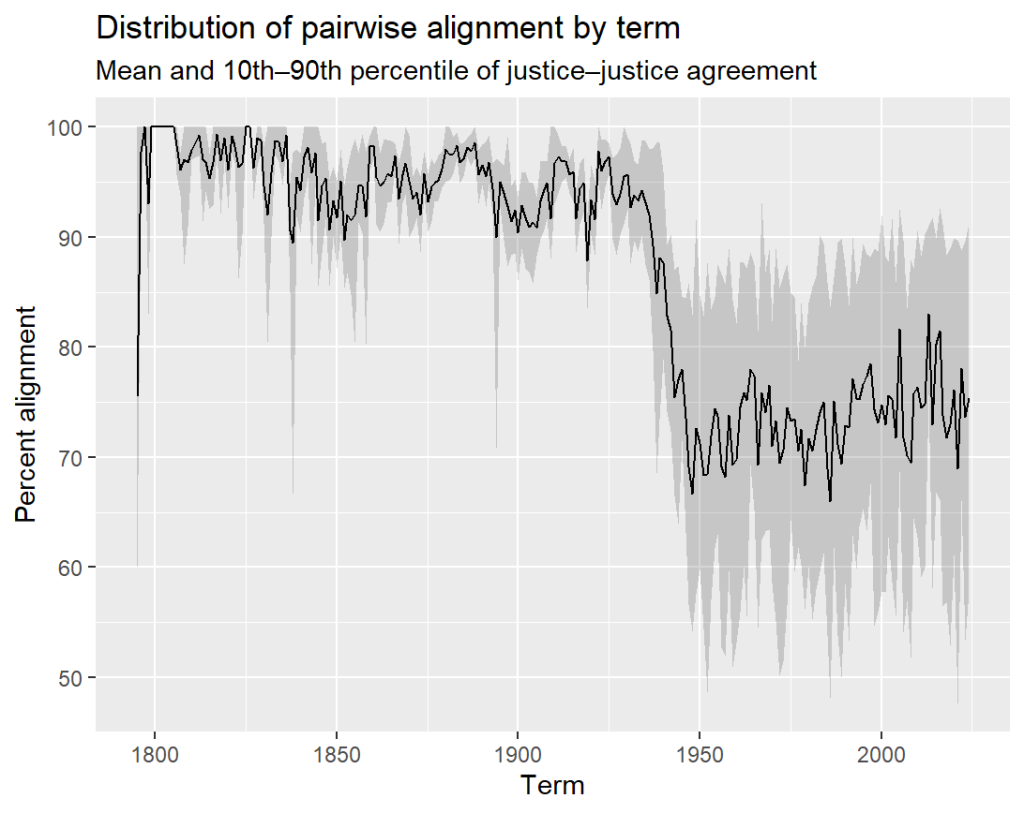 Using comprehensive data on the justices’ agreement rates from 1791 to 2025, we can now trace how justices form coalitions and when these drift apart. This analysis reveals not just whether justices agree, but the dramatic transformation in how much they agree – and disagree – across American constitutional history.