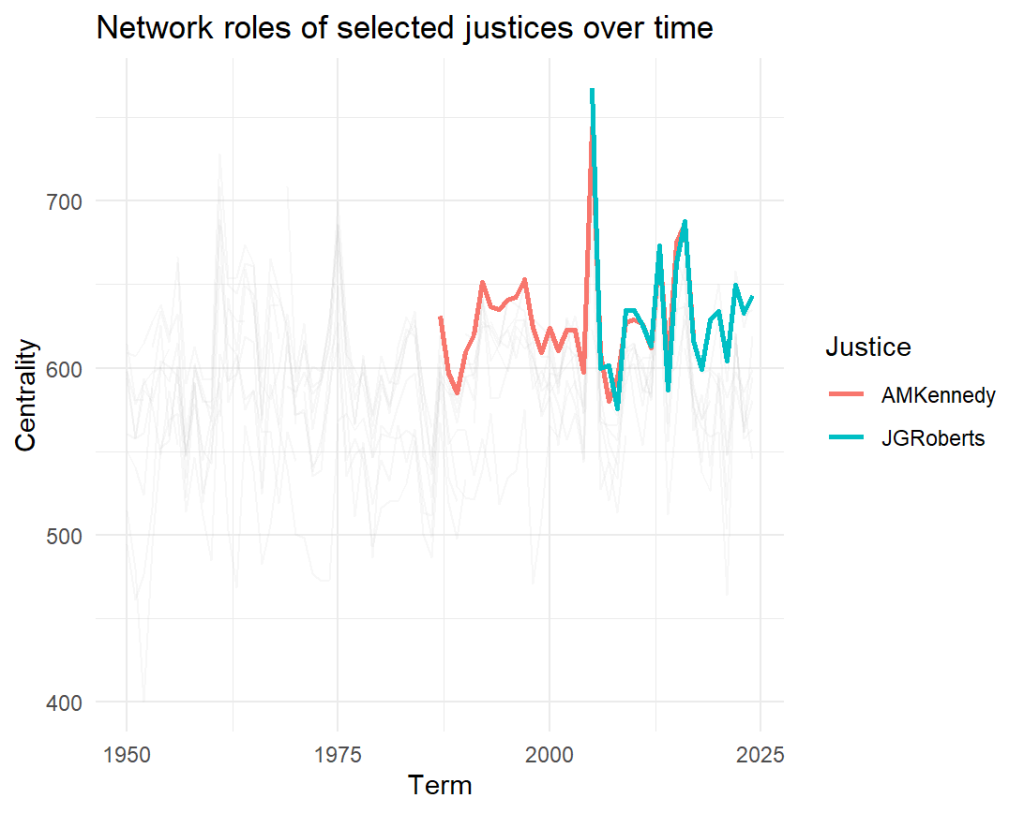 Chief Justice John Roberts tells a different story. His swing-votes spiked dramatically around 2006-08, even briefly exceeding Kennedy’s peak, reflecting his early institutionalist bridge-building (such as his vote in the Affordable Care Act case). However, this centrality has declined in recent years, settling into a range typical of more consistently conservative justices. Thus, since Kennedy’s retirement in 2018, no justice has really emerged as a true swing vote.