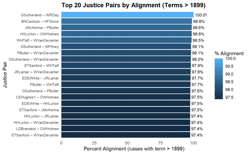 Moving to the 20th century, the strongest alignments (for justices with votes in at least 20 shared cases) principally come from earlier in the century. Justice George Sutherland’s perfect alignment with Justice William R. Day and near-perfect alignment with Justices Willis Van Devanter, Pierce Butler, and Mahlon Pitney captures the core of the court’s conservative, pro-business wing that dominated in the 1910s and 20s and later formed part of the “Four Horsemen” against the New Deal.