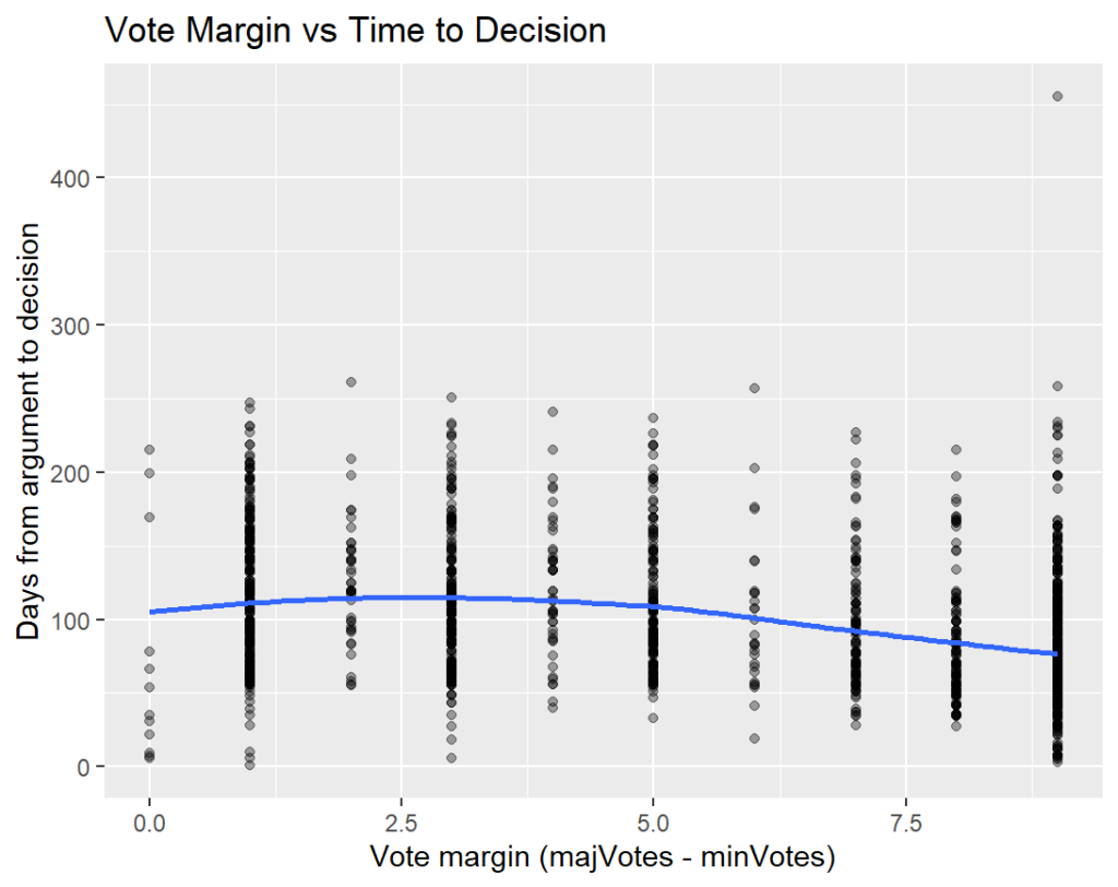 The relationship between case divisiveness and decision timing reveals one of the dataset’s clearest patterns, mentioned earlier: close cases take substantially longer to decide. Unanimous 9-0 decisions average just 76.6 days from argument to opinion, while 5-4 decisions average 112.7 days. But the pattern is not entirely linear – the longest delays come in two-vote margin cases (125.1 days average) and four-vote margin cases (121.6 days average), suggesting that cases with highly unstable coalitions pose particular challenges.