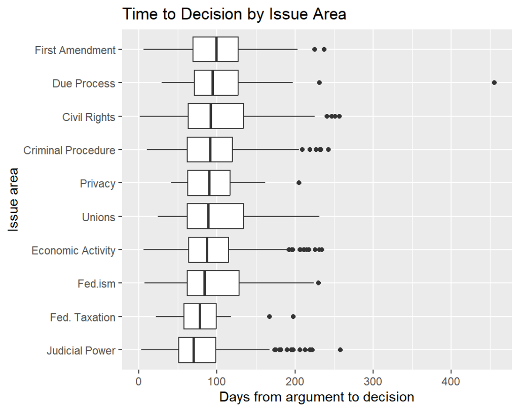 The issue area timing differences shown in the graph above may also reflect the political salience of different case types. First Amendment cases often involve contentious questions about speech, religion, or press freedoms that require careful coalition-building. Judicial power cases, by contrast, frequently present more technical questions about standing, mootness, or appellate jurisdiction that, while important, may generate less disagreement among the justices and thus require less time to decide.