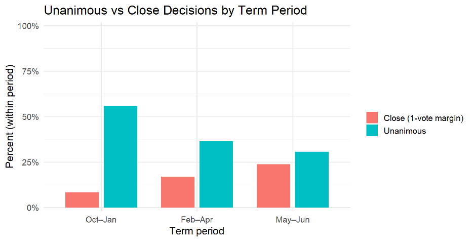 One of the most revealing patterns in the data concerns the relationship between case timing and vote division across the entire set of cases since the 2000-01 term. The numbers suggest a clear pattern (which should be quite familiar to court watchers): the court releases its less controversial decisions early and its most divisive cases later on. The figure below reports the share of decisions within each period that are unanimous (9–0) or narrowly divided by a single vote (5–4).
