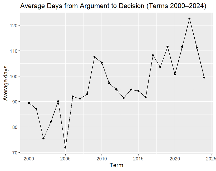 In the early 2000s, the average argued case took approximately 85-90 days from oral argument to decision. That figure has risen steadily. The 2022-23 term marked a recent peak, with cases averaging 122.6 days from argument to decision – nearly three weeks longer than the historical average. During this period, a case argued in early November would, on average, not see a decision until mid-March, and potentially much later.