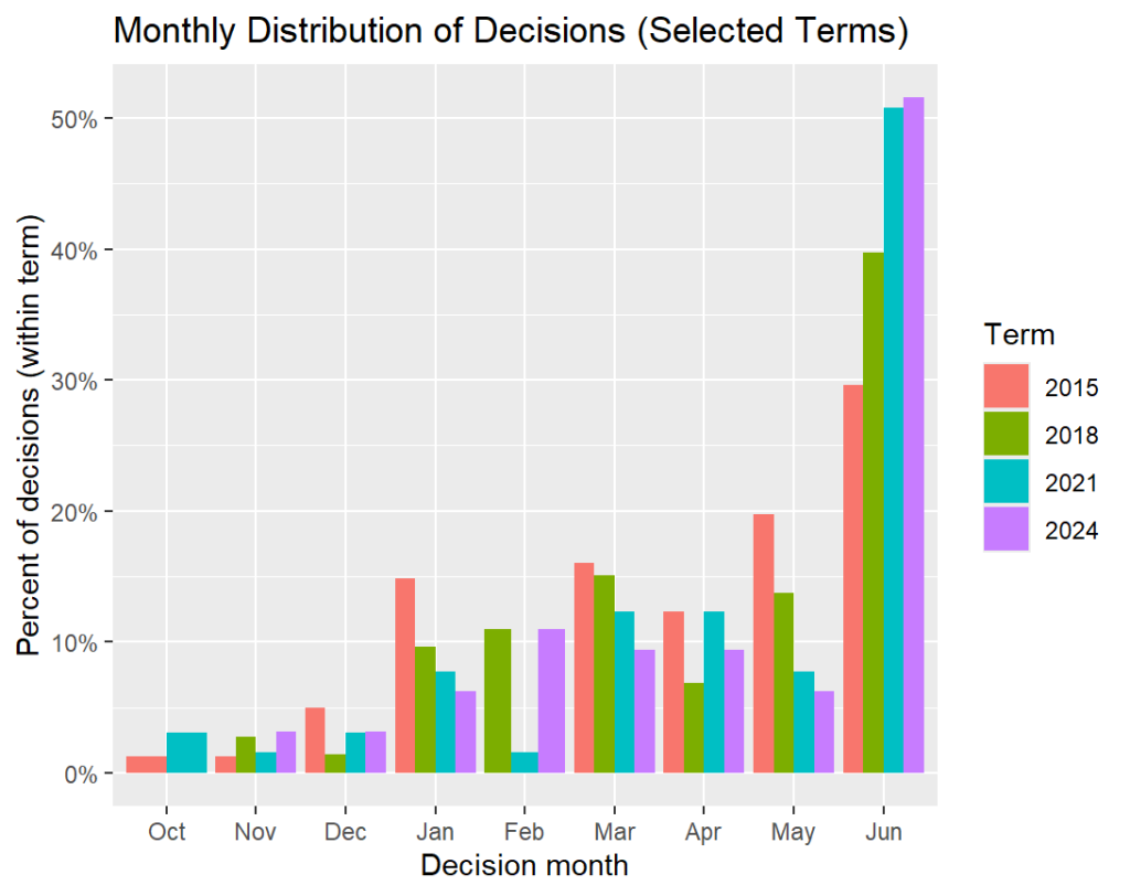 The numbers are, again, striking. Since 2000, June accounted for roughly 30-35% of the court’s annual decisions. In recent terms, that figure has exploded. During the 2023-24 term – the same term that produced only two decisions between October and January – a staggering 84.5% of all decisions came in the April-through-June window, with June alone accounting for 50% of the term’s output. The 2024-25 term showed a similar pattern, with 76% of decisions concentrated in the final three months.