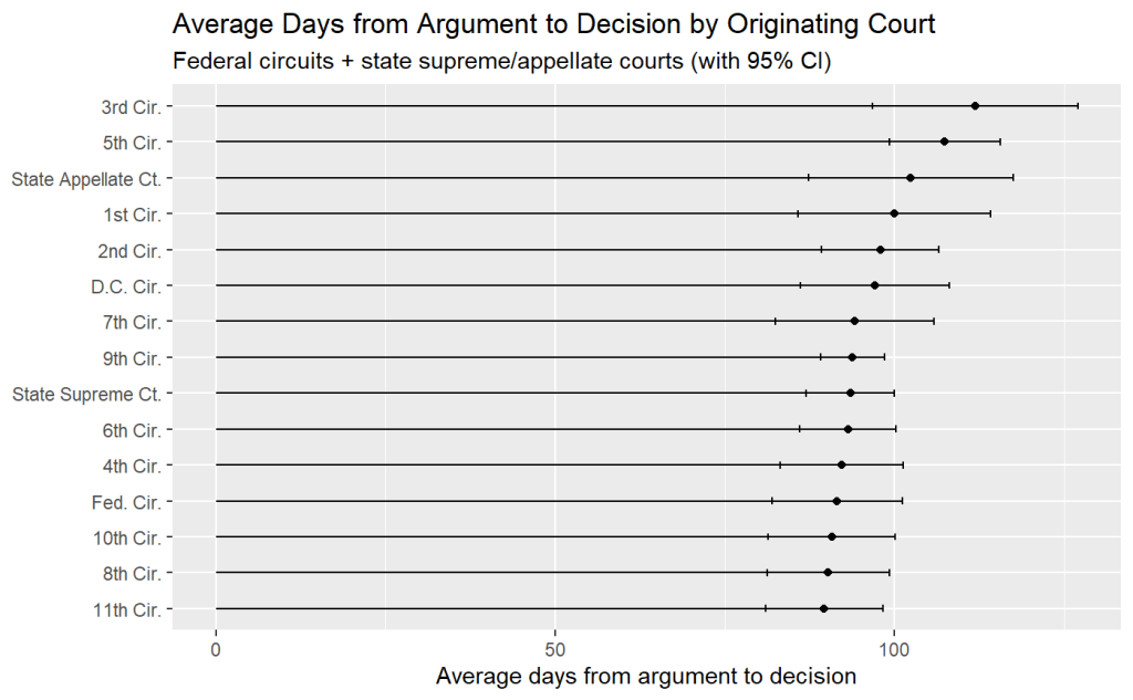 The lower court from which a case arrives also significantly predicts how long it will take the Supreme Court to issue its decision. Cases from the U.S. Court of Appeals for the 3rd Circuit average 111.9 days from argument to decision, the longest of any circuit. The U.S. Court of Appeals for the 5th Circuit follows at 107.4 days. By contrast, the U.S. Court of Appeals for the 9th Circuit – despite generating more Supreme Court cases than any other circuit (which is unsurprising, given that it is the largest circuit) – sees its cases decided in an average of just 93.8 days.