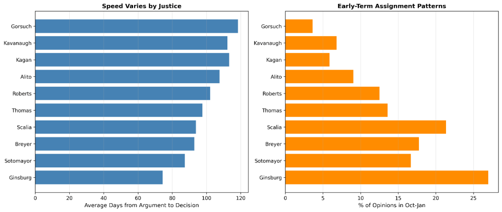 These patterns correlate with early-term output in revealing ways. Ginsburg authored 27% of her opinions in the October-through-January period, the highest rate in the dataset. The late Justice Antonin Scalia, at 21.4%, and Breyer, at 17.8%, also showed strong early-term productivity. Among current justices, Thomas leads with 13.6% of his opinions coming early in the term, while Gorsuch is at only 3.6%.