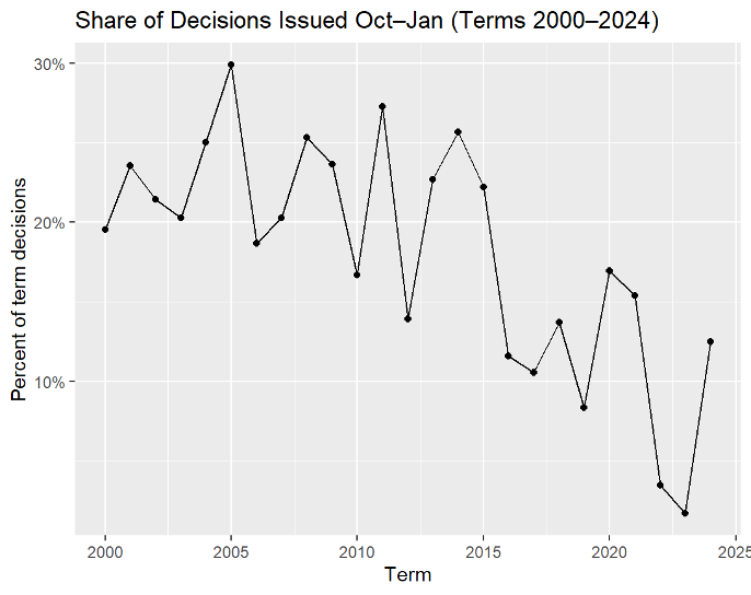 Then something changed. Beginning around 2016, the proportion of early-term decisions began to plummet. By the 2023-24 term, the court issued only two decisions between October and January – a modern anomaly. The 2024-25 term was only marginally different, producing just a single decision between October and January, representing less than 2% of that term’s output. For two consecutive terms, the court thus essentially abandoned its practice of issuing opinions in the fall months. In other words, the tradition of the “fall docket” – a recognizable feature of the court’s calendar for decades – effectively disappeared.