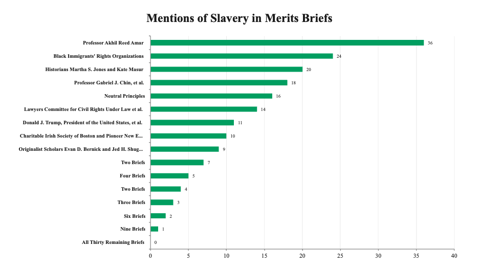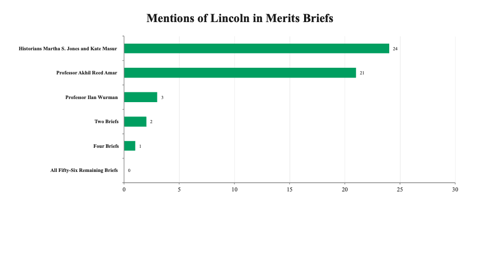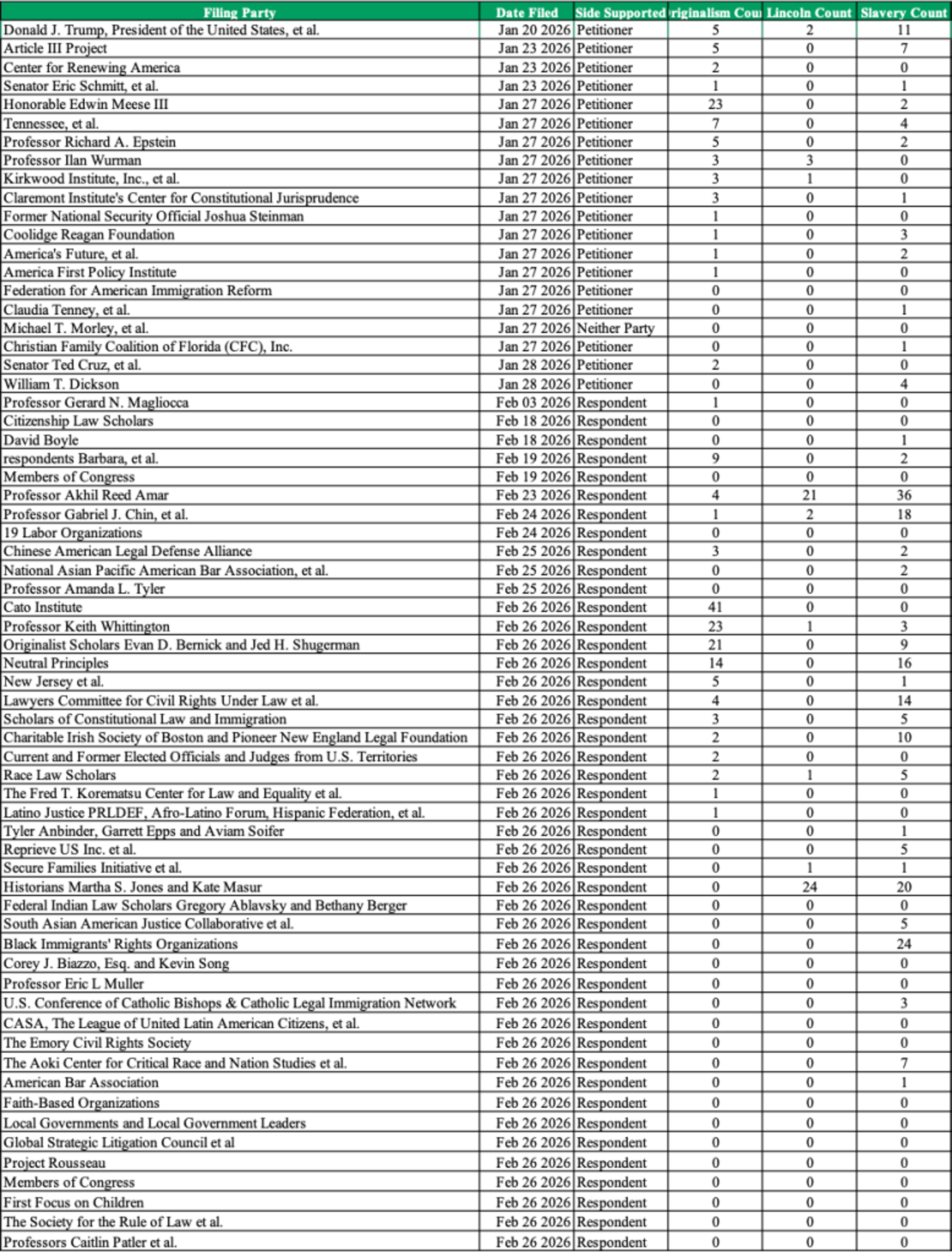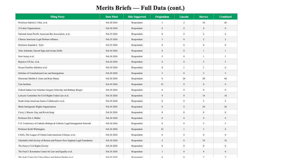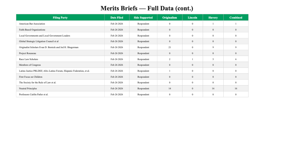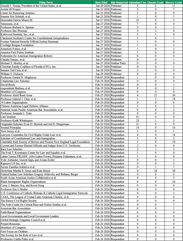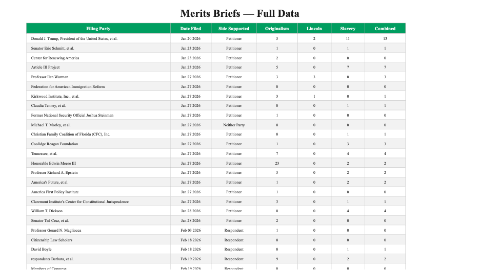 The divide between the two sides is itself revealing. Of the 20 petitioner-side briefs (that is, in support of the Trump administration), not a single one mentions Lincoln more than three times, and only two mention slavery more than five times. The pattern suggests that the side seeking to narrow birthright citizenship has avoided the historical materials most relevant to understanding the clause’s original meaning – an odd posture for self-described originalists.