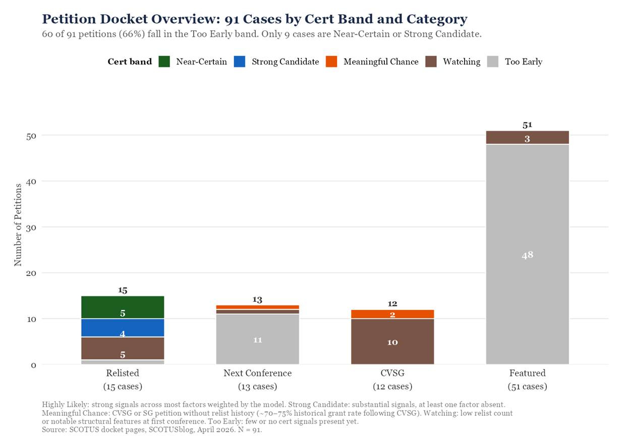 The analysis is based on a comprehensive tracker of pending cert petitions across four categories: relisted cases, petitions set for the next conference, featured petitions (by SCOTUSblog), and calls for the views of the solicitor general. Each case is assessed using a weighted formula that treats relist count as the most important factor, then layers in circuit split confirmation, dissents below, CVSG status, whether the solicitor general is a petitioner, amicus activity at the cert stage, and counsel quality to determine which cases are most likely to be granted.